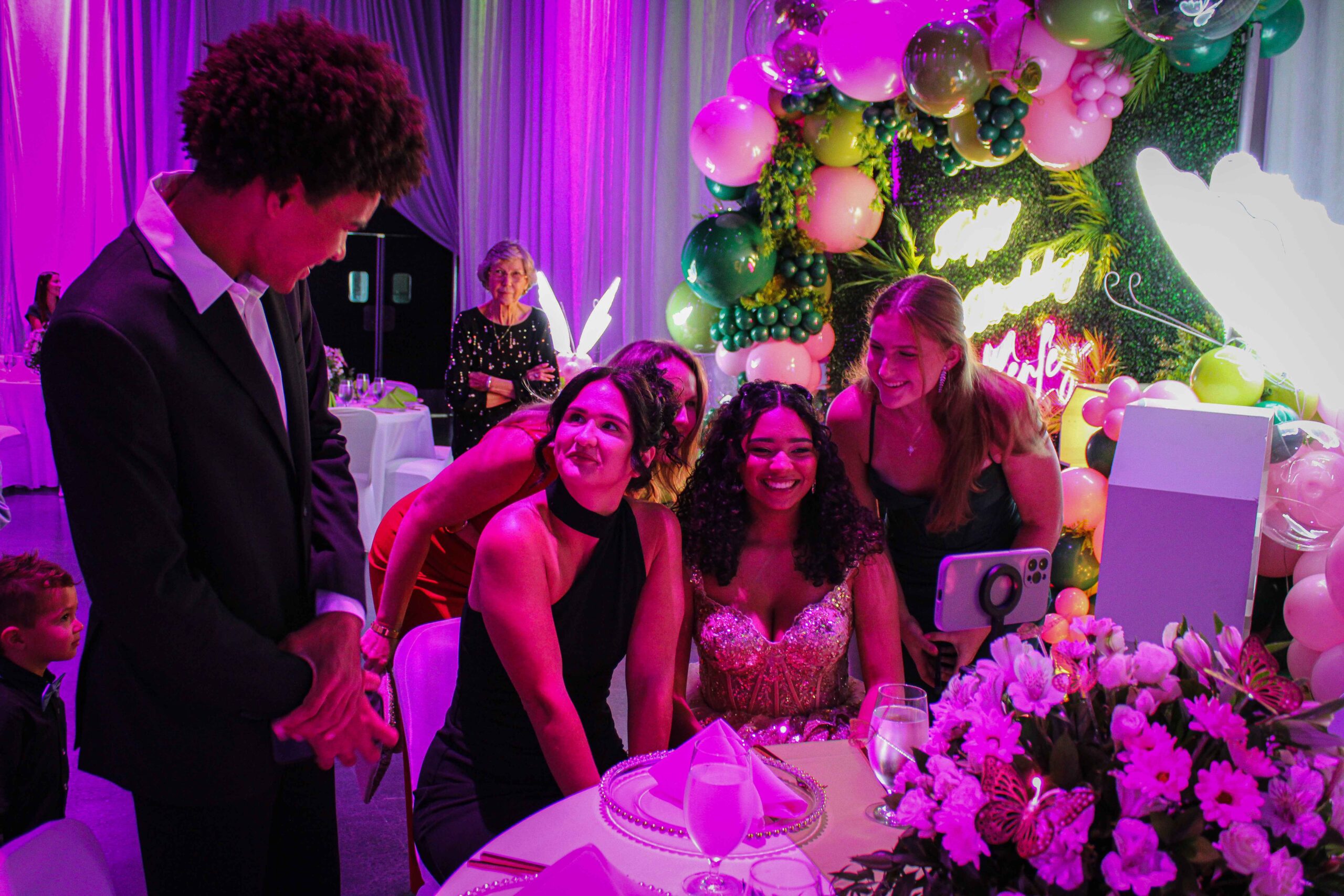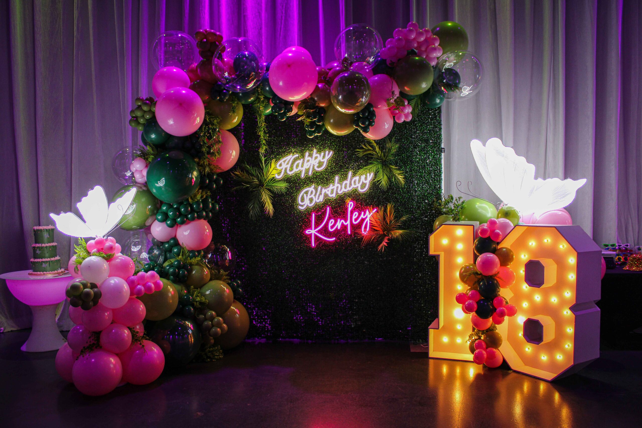 This vibrant 18th birthday celebration at The Loft in Boca Raton was designed to be bold, elevated, and unforgettable. The space was transformed with rich pink and purple lighting, lush florals, and a statement balloon installation featuring a custom neon sign and illuminated “18.” Guests enjoyed interactive moments at a glam photo booth, a high-energy dance floor, and a fully styled bar experience. The birthday girl made a stunning entrance in a sparkling gown, setting the tone for a night full of excitement and celebration. Every detail was thoughtfully curated to create a fun, stylish atmosphere that perfectly marked this milestone moment.